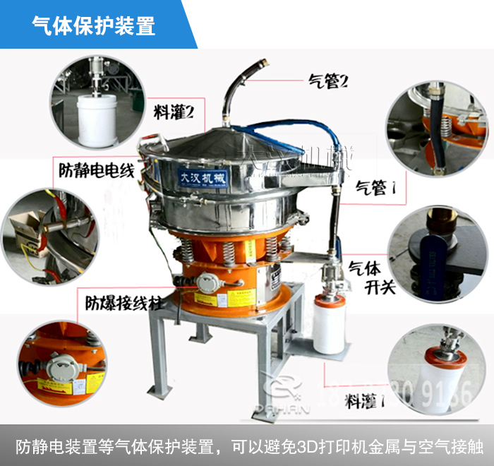 3D打印機(jī)金屬粉與空氣接觸易發(fā)生爆炸,在選擇振動(dòng)篩時(shí)這是用戶擔(dān)憂的一個(gè)問題,所以對(duì)于振動(dòng)篩選型來說是需要極其謹(jǐn)慎的。氣體保護(hù)振動(dòng)篩機(jī)是針對(duì)某些物料的特性加裝的,比如有些物料不能接觸氧氣,二氧化碳等等,采用氣體保護(hù)軟管,防靜電裝置等氣體保護(hù)裝置,可以避免3D打印機(jī)金屬與空氣接觸。